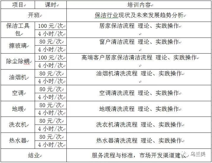 根據(jù)目前家政保潔市場(chǎng)需求及社會(huì)人員就業(yè)需要,經(jīng)公司研究決定,烏蘭美將推出家電清洗保潔培訓(xùn)班。通過(guò)家電清洗保潔培訓(xùn)班提高從業(yè)人員行業(yè)的操作專業(yè)水準(zhǔn),更好的為我市市民提供優(yōu)質(zhì)的服務(wù)。